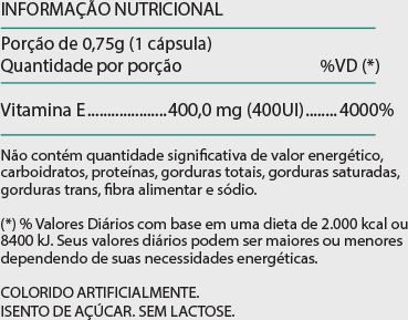 Cronovit Vitamina E é um suplemento alimentar com ação antioxidante, auxilia na redução dos radicais livres do organismo. Está indicado na deficiência de vitamina E, em dietas restritivas e inadequadas, possui papel importante na prevenção de doenças cardiovasculares e para modular a função imunológica, melhorando suas ações e reduzindo o risco de infecções.